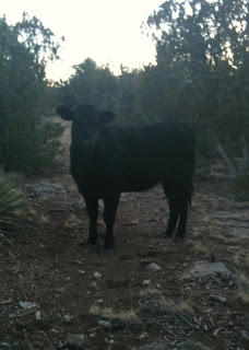 Thanks to our little fish pond, we get all kinds of wild visitors at the house: deer, coyotes, rabbits, birds, snakes, lizards, butterflies, tarantula hawks (very frightening three-inch long glossy black wasps with bright orange wings) and cows. Yes, wild cows. New Mexico is a fence-out rather than fence-in state so every now and then, we end up with someone's cows wandering through our front lawn. This week, however, the cow that stopped by decided to stay. The owner knows she is here but she is incredibly shy and with 25-acres to roam, she is impossible to find purposefully. In her honor, today's symbol is the cow.